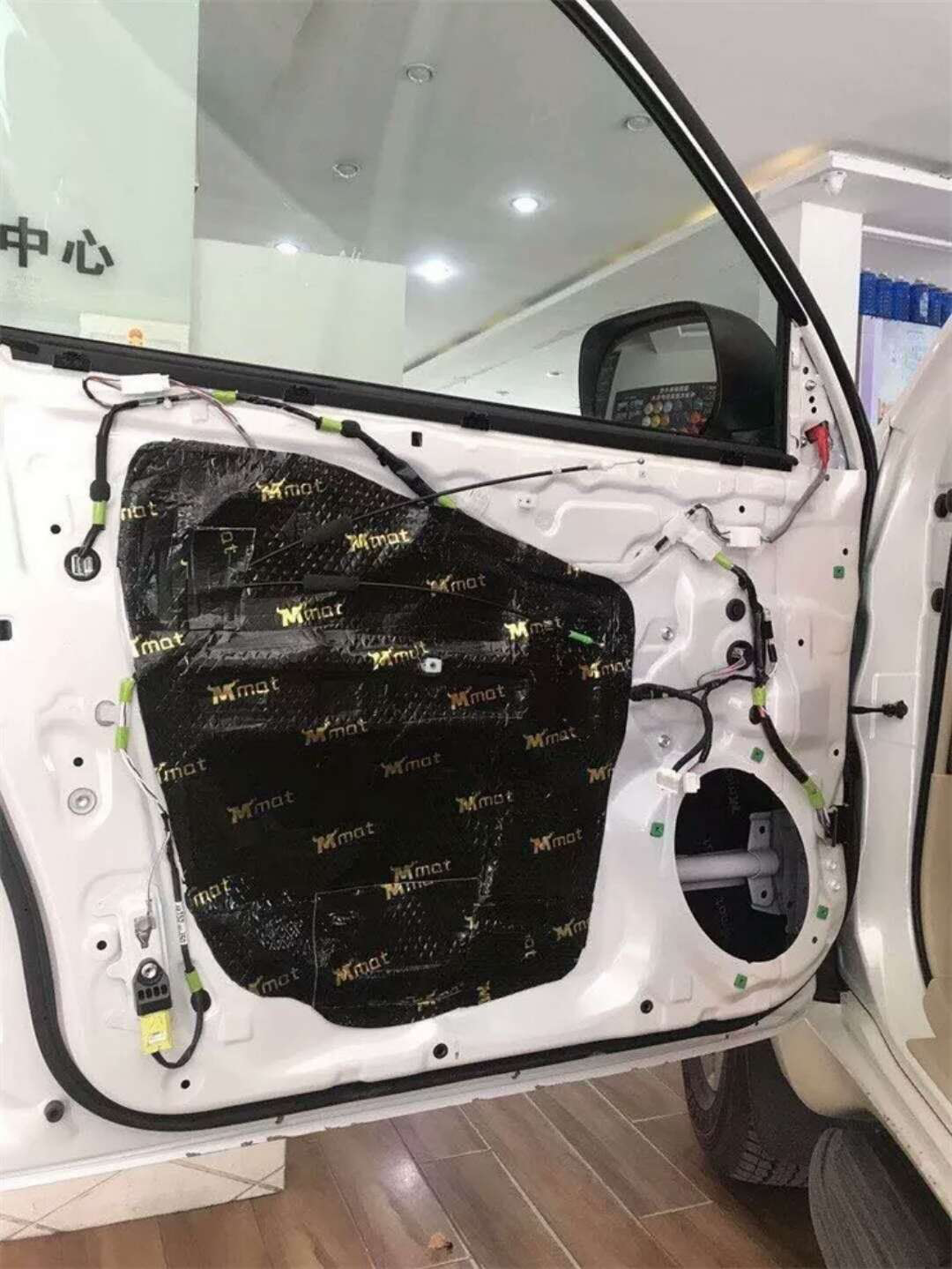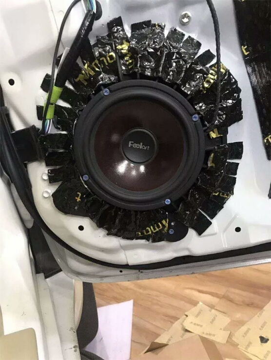 贴上隔音止震板,止震板主要减少来自汽车自身的噪音,前声场喇叭采用的是芬朗SQ-6.5E二分体套装喇叭,使其声音质感,人声真实性,临场性都得到了完美的体现。深受广大汽车音响爱好者的喜爱。